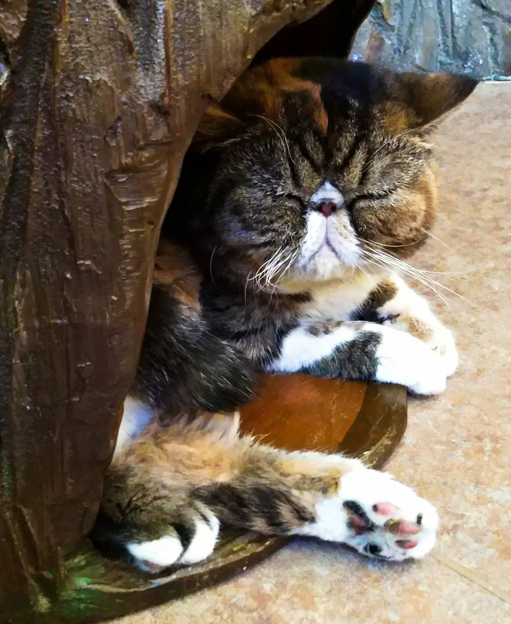 Trudno oddać słowami jak te koty bardzo miały nas w nosie (żeby nie powiedzieć w dupie). Co prawda jeden w typie grumpy cat twardo spał w pieńku pode mną, ale cała reszta stada traktowała nas z wyniosłą obojętnością. Tymczasem Japończykom niemal skakały po głowach (a nawet spały w torebkach).