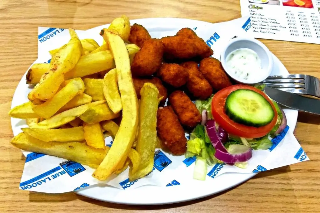 Podstawowy zestaw fish & chips w Blue Lagoon kosztuje 7,5 funta. Ryba jest fantastyczna, ale frytki. Jakby to napisać. Jadalne i nic nad to.