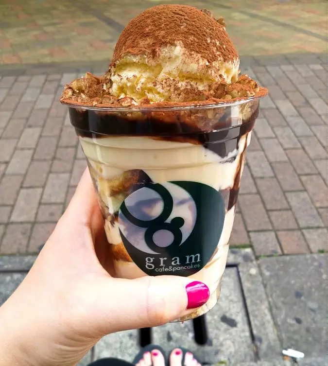 W wersji dla niecierpliwych puchaty naleśnik (placek) ląduje w kubku z truskawkami lub tiramisu (500¥).
