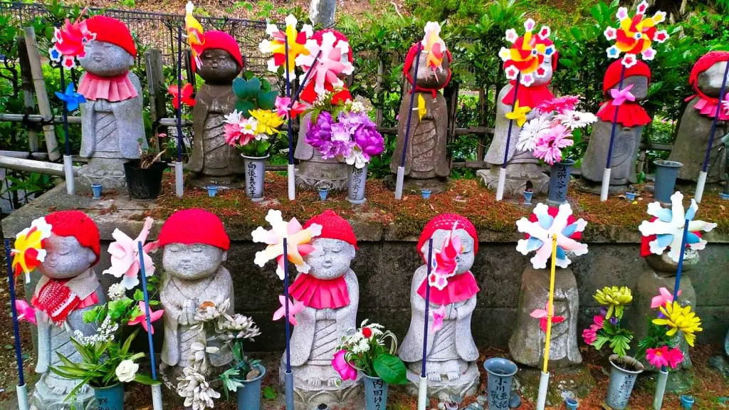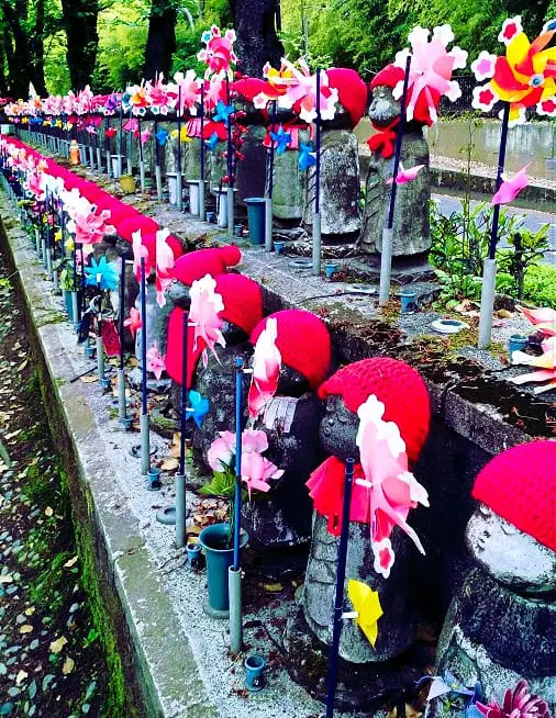 Wszystko to za sprawą kilkuset figurek Jizo – nie większych od lalek kamiennych posążków, w kolorowych czapeczkach, niekiedy też kubraczkach lub fartuszkach i z nieodzownym wiatraczkiem w garści. I pewnie byłoby to bardziej malownicze niż upiorne, gdyby nie pewien drobiazg. Posążki Jizo – opiekuna Wodnych Dzieci – upamiętniają dusze dzieci nienarodzonych lub zmarłych.