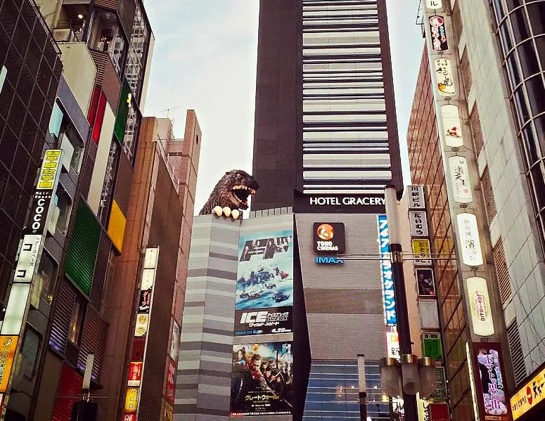 Dwunastometrową głowę tego włochatego drania znajdziecie na dachu budynku Toho Cinemas Shinjuku. Jest dobrze widoczny od strony wejść do kina. Kina, które w nazwie ma Shinjuku, to w zasadzie leży w sercu Kabuki-cho – tokijskiej dzielnicy czerwonych latarni (podobno opanowanej przez yakuzę, ale ponieważ to Japonia włos nie spadnie ci tu z głowy).