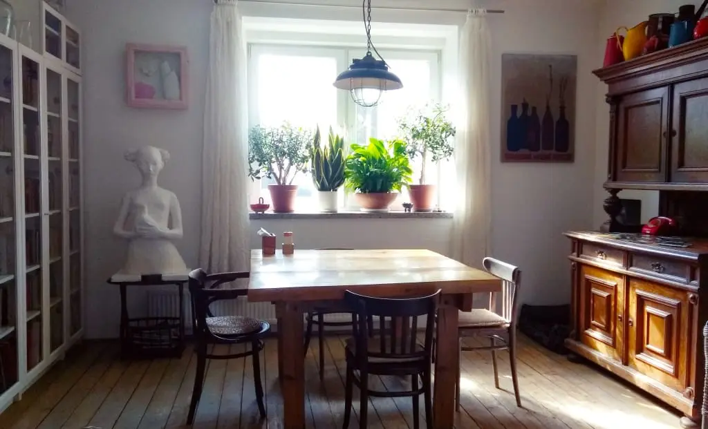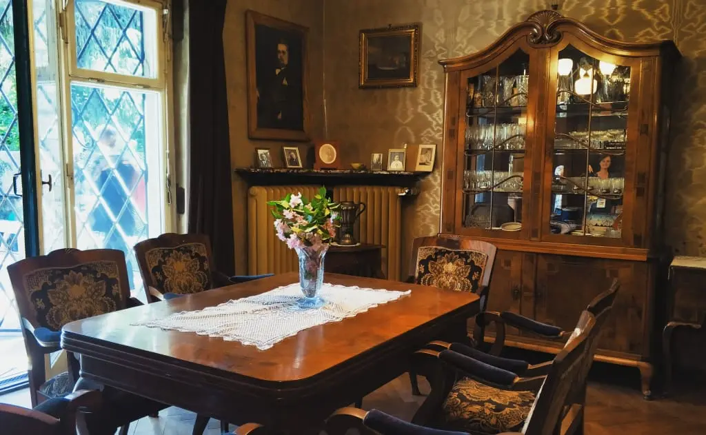 A jadalnia to skok w czasie, prosto do przedwojennego mieszczańskiego salonu. Każdy element (no może prócz kwiatów w wazonie) to oryginał z lat trzydziestych (włącznie z tapetami).