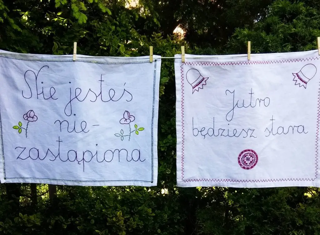 U Bettiny Bereś sztuka czekała już w ogrodzie. Na sznurach – zamiast prania – dzieła gospodyni, która prócz tego, że jest malarką (ba, prowadzi wypożyczalnię obrazów!) również wyszywa (makatki i serwetki w feministyczne hasła).