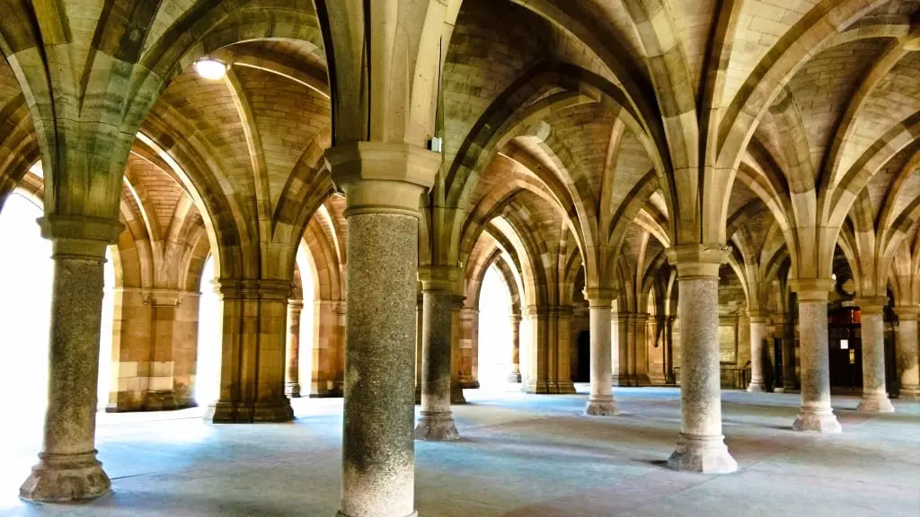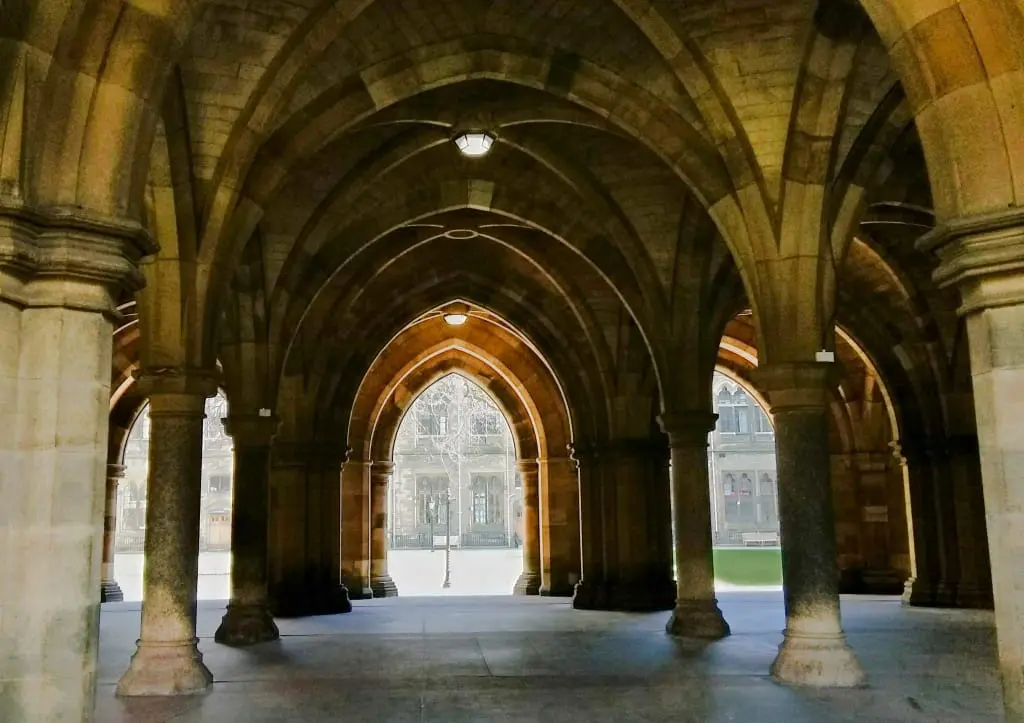 Potężny kompleks neogotyckich budynków uniwersyteckich (oczywiście z czerwonego piaskowca) wybudowano w drugiej połowie dziewiętnastego wieku. Jest szalenie klimatyczny. Warto zapuścić się za uniwersytecką bramę, bo wewnątrz głównego gmachu czeka spektakularna kolumnada i dwa ukryte dziedzińce. Oraz muzeum Hunterian (o którym więcej za moment).