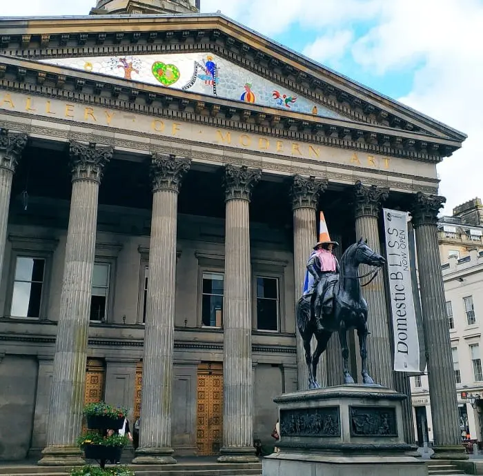 Fun facts: Przed GoMa stoi pomnik Diuka Wellington, który nie byłby wart wzmianki gdyby nie oryginalne nakrycie głowy. Mianowicie pachołek. No wiecie, taki biało-pomarańczowy stożek, atrybut robotników drogowych. Nie wiadomo skąd się wziął na głowie jego książęcej mości, ale faktem jest, że pachołek oparł się niezliczonym próbom usunięcia i zrósł (zapewne na) wieki wieków z głową Wellingtona. Teraz jest jednym z symboli Glasgow.