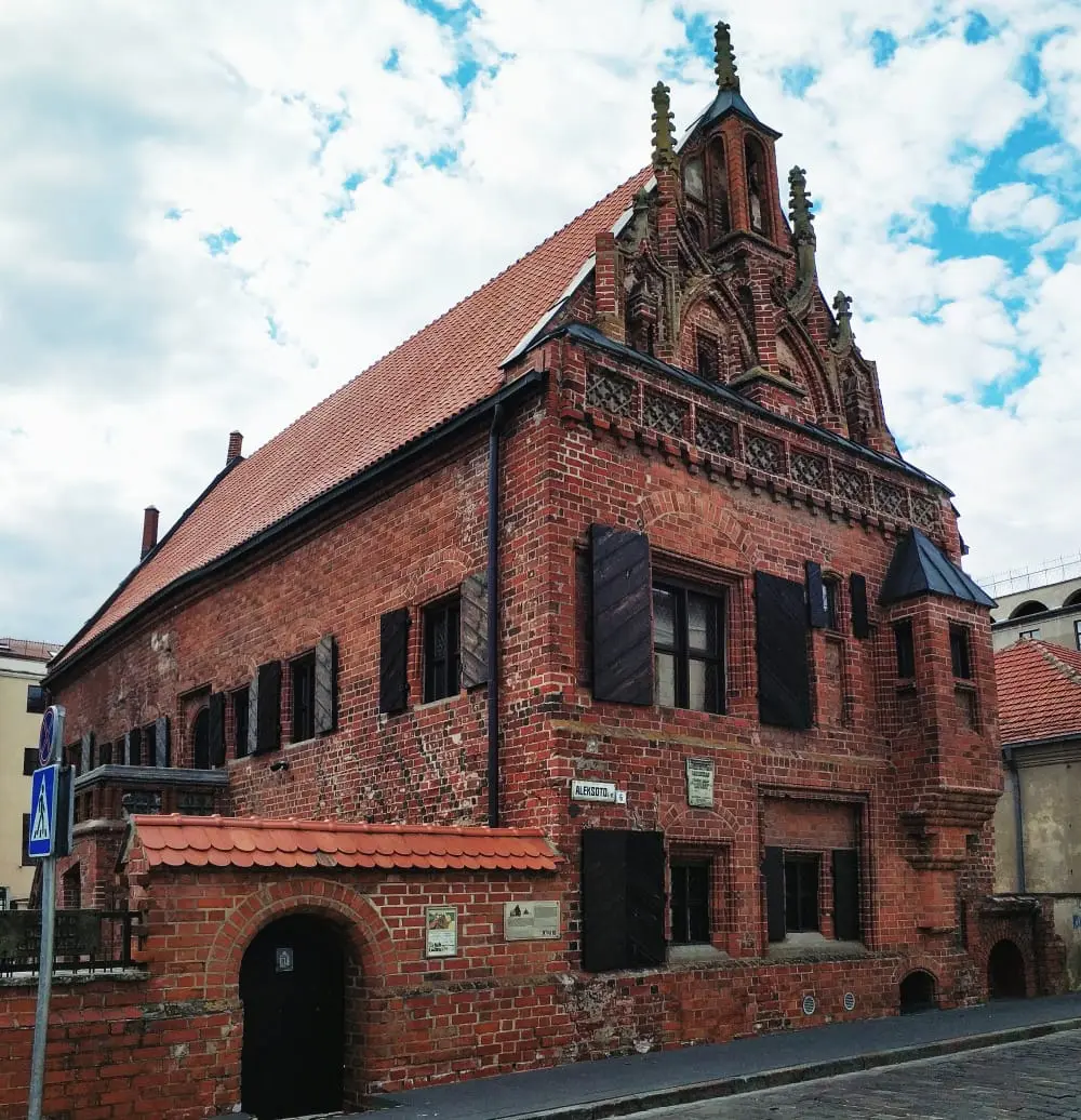 Więcej szczęścia miała śliczna gotycka kamienica kupiecka zwana domem Perkuna (Perkūno namas) z drugiej połowy piętnastego wieku. Wygląda nader oryginalnie w zestawieniu z resztą zabudowy Kowna, a już zwłaszcza z ulokowanym na jej tyłach luksusowym gimnazjum jezuickim.