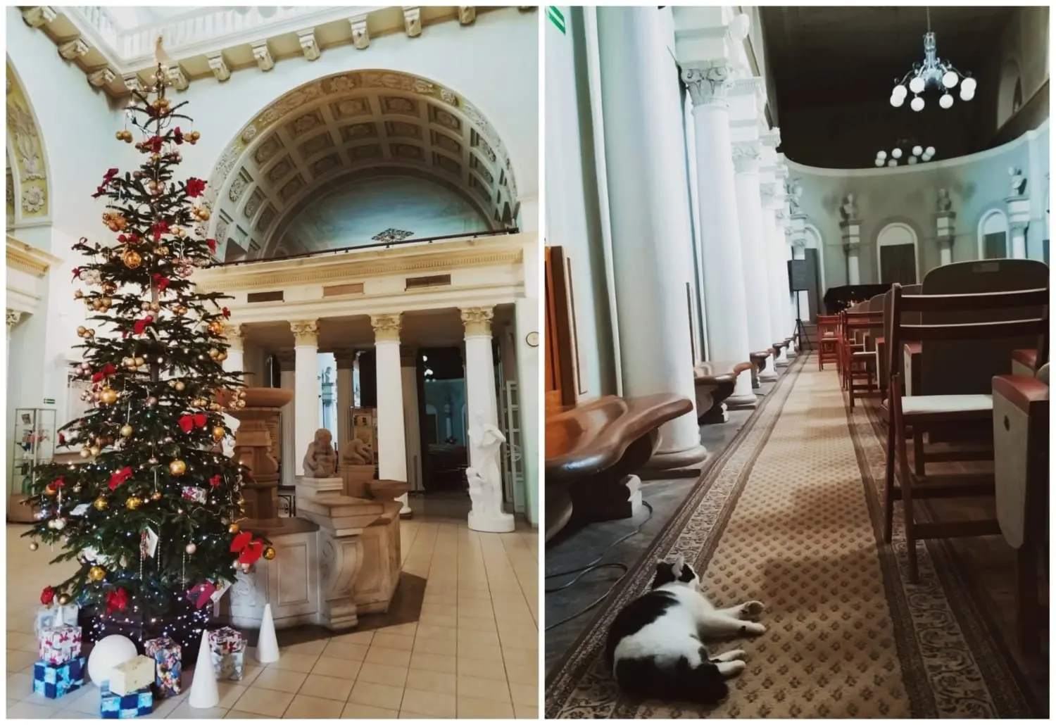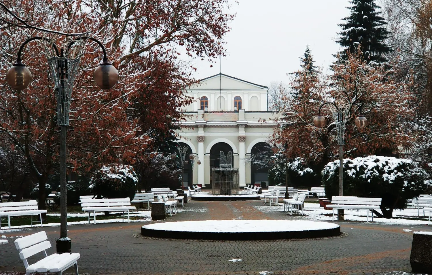 Park Zdrojowy daje radę nawet w grudniu. No dobrze, akurat w Busku-Zdrój spadł śnieg, który z miejsca dodaje malowniczości (pustym rabatom i łysym drzewom). Swoje robią też przechadzające się alejkami tłuste koty i ganiające po drzewach wiewiórki. No i knajpka Zakąski i Napitki, która karmi smacznie (i w niewygórowanych cenach).