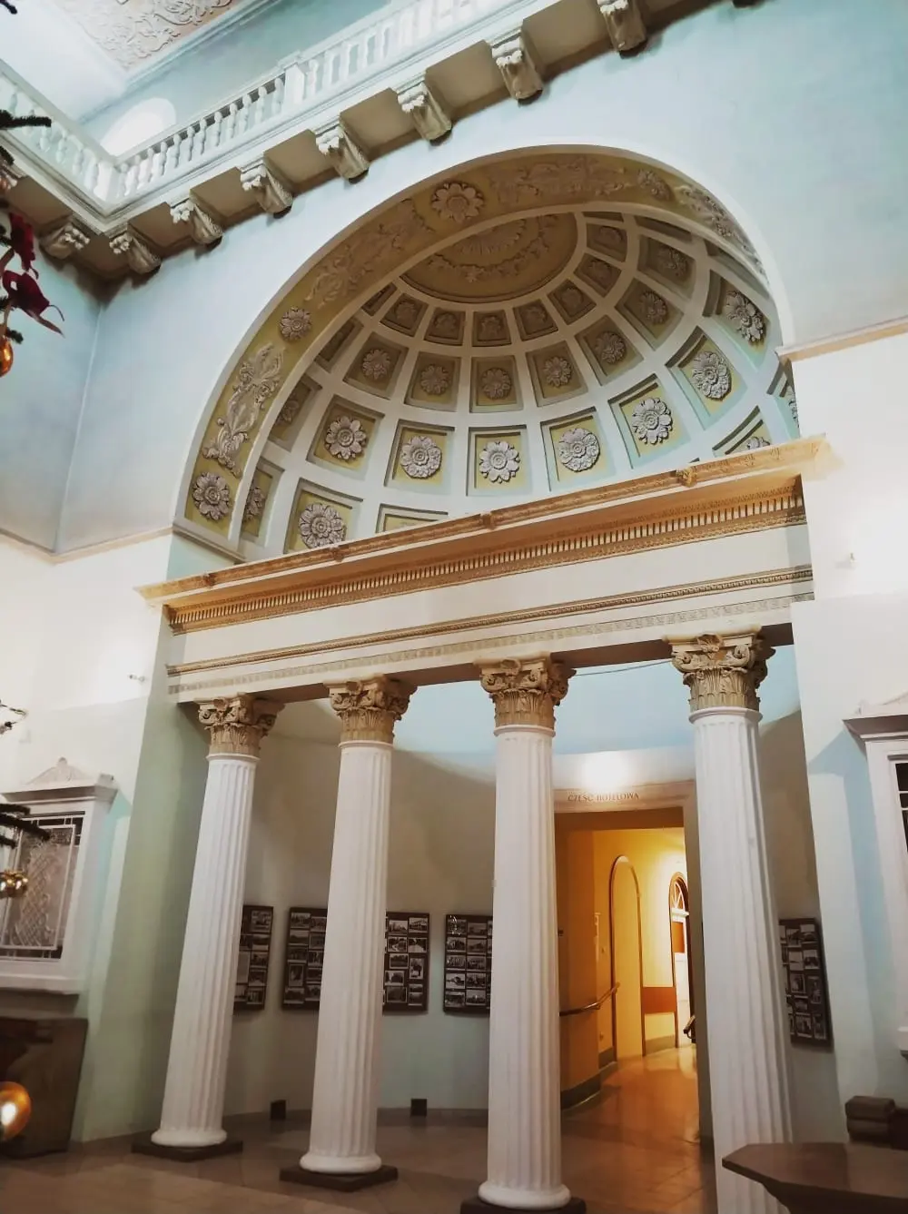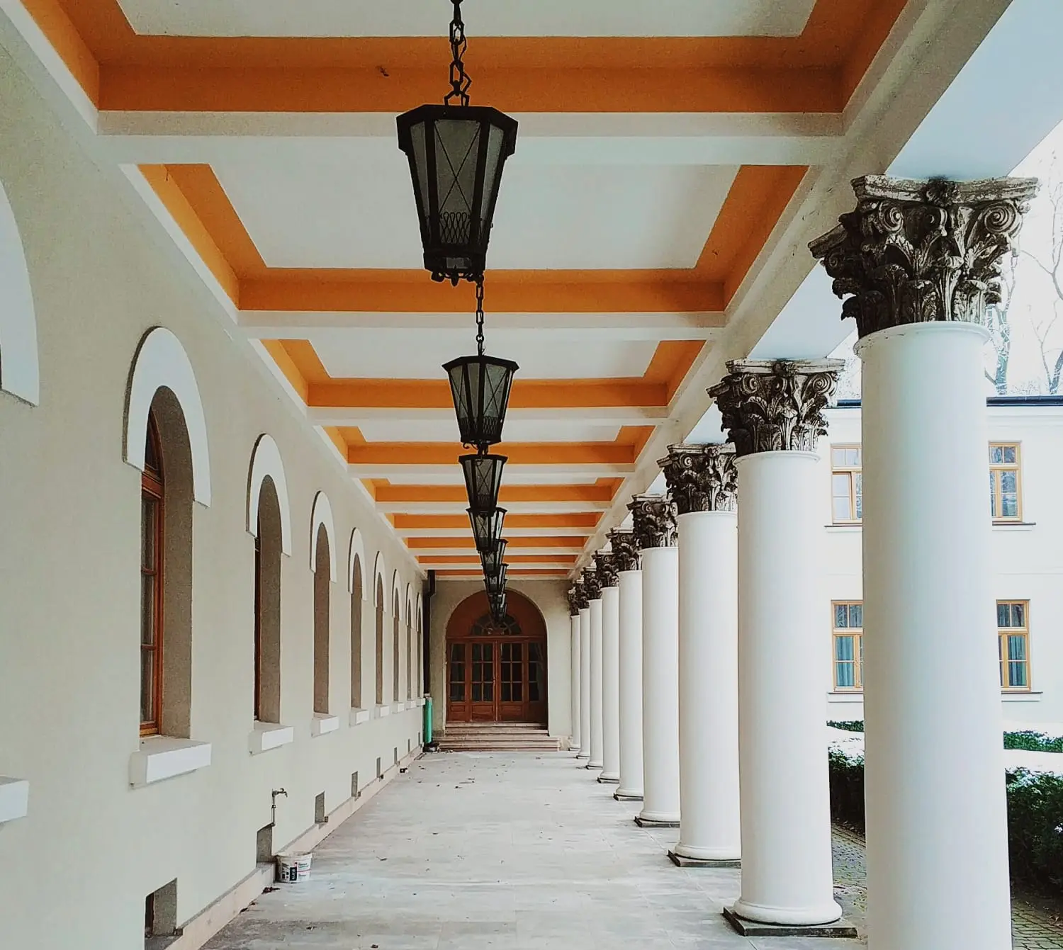 Z zewnątrz sanatorium Marconi wygląda dumnie (kolumnady!), ale to jest nic w porównaniu z wrażeniem jakie robi westybul. Wewnątrz (gdy już złapiesz dech z wrażenia i obfitości H2S) czeka pijalnia wód zdrojowych (szumna nazwa kilku kranów, ale konsumpcja do własnego naczynia darmowa, przy czym walory zdrowotne nie idą w parze ze smakowymi, tak tylko ostrzegam), sala koncertowa i sklepik z uzdrowiskowymi specyfikami (kosmetyki, wody mineralne, a nawet miody).