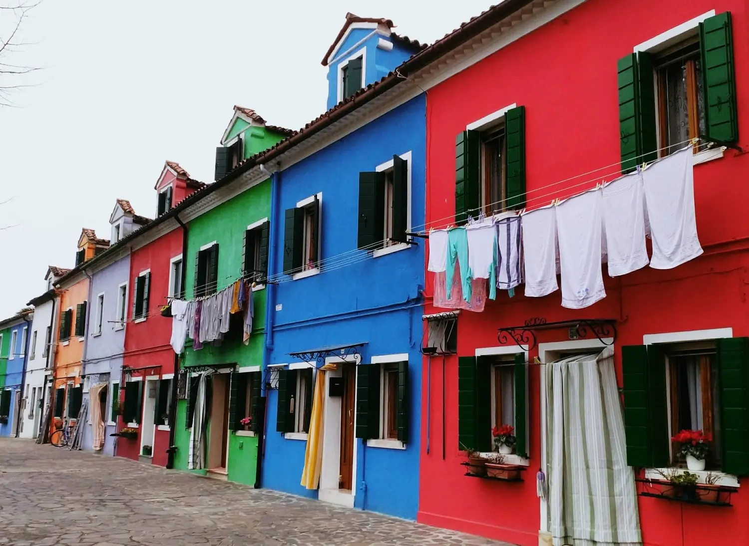No bo zobaczcie sami: malutka wyspa*, zabudowana podobnymi kamieniczkami. Tylko że każda z tych kamieniczek jest w innym kolorze. Żadna tam subtelna pasteloza z polskich blokowisk. Burano jest na maksa krzykliwe i pstrokate**.