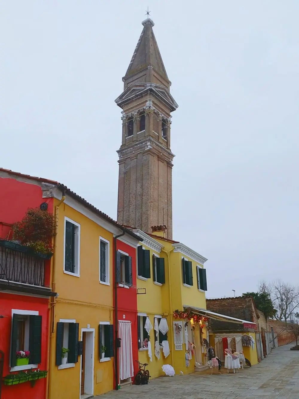 Jedyny niekolorowy budynek na Burano to (suprise, suprise) kościół – Chiesa di San Martino. I nie trzeba mieć sokolego wzroku, aby zorientować się, że jego wolnostojąca dzwonnica (campanile) trochę bardzo odchyla się od pionu. Ergo Piza nie ma monopolu na krzywe wieże.