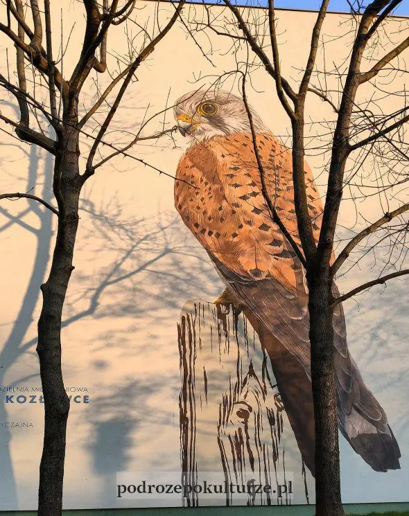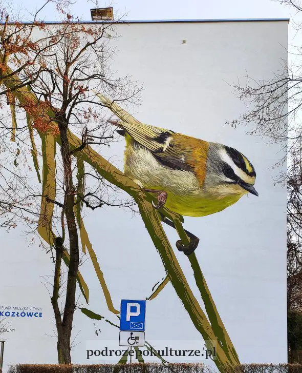 Ściany szczytowe bloków osiedla z wielkiej płyty “Na Kozłówce” zdobią… ptaki w rozmiarze XXL: dzięcioły wielki i zielony, pustułka, żołna, zimorodek, kraska, słowik, zniczek i tak dalej. Namalował je Wojciech Rokosz, a zainspirowała go pobliska dolina Drwinki – uroczej dzikiej rzeczki, której bieg wyznacza południową granicę osiedla. Murali póki co jest dwanaście (?), ale to nie jest ostatnie słowo. Spółdzielnia mieszkaniowa ponoć planuje awifauną ozdobić wszystkie ściany szczytowe. A jest ich dziewięćdziesiąt sześć!