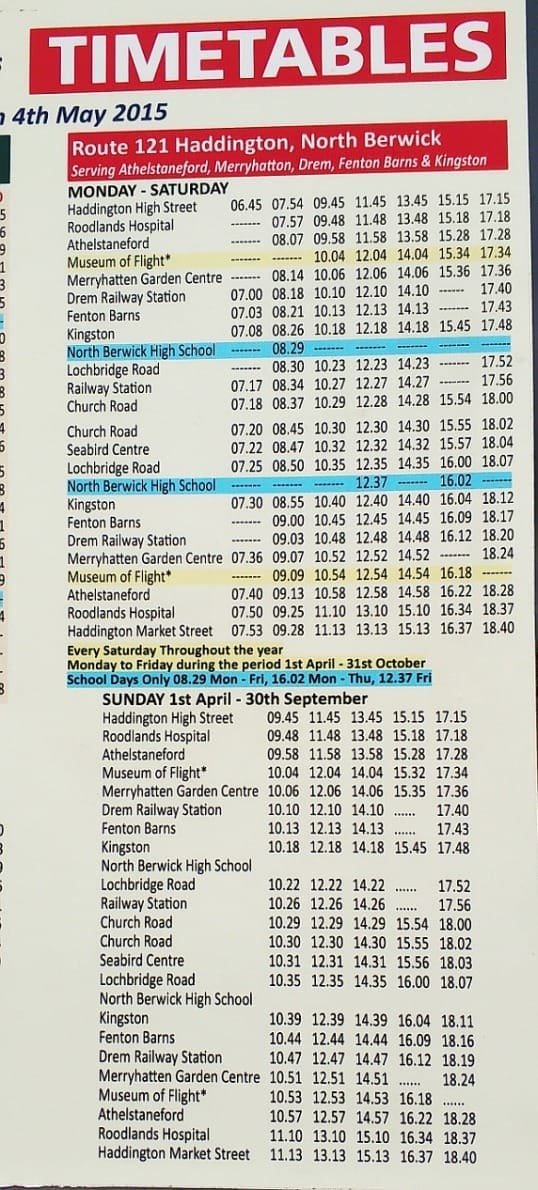 Kursujący między North Berwick i Haddington autobus 121 to jedyny sposób, by dostać się bezpośrednio do Muzeum Lotnictwa. Ale uwaga: 121 kursuje rzadko i w dodatku nie każdy kurs zahacza o East Fortune. Rozkładu jazdy 121 ze świeczką szukać w całym bożym internecie, więc łapcie zdjęcie rozkładu z przystanku. Bilet w obie strony w czerwcu 2019 kosztował 4 funty (można płacić kartą).