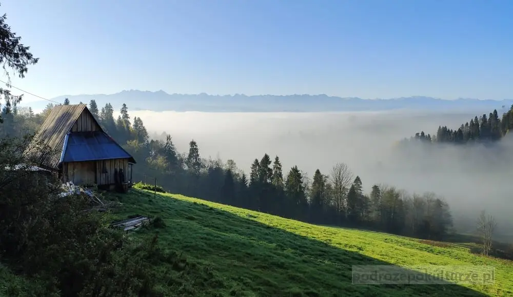 Myślałam, że w temacie ‘góry jesienią’ już nic mnie nie zdziwi, po spektaklu jaki zrobiła natura na zamku w Czorsztynie (wtem rozeszły się mgły, zaświeciło słońce, a na horyzoncie zamrugały Tatry). Ale jednak nie, panorama z bacówką gdzieś pod przełęczą Knurowską przebiła wszystko.