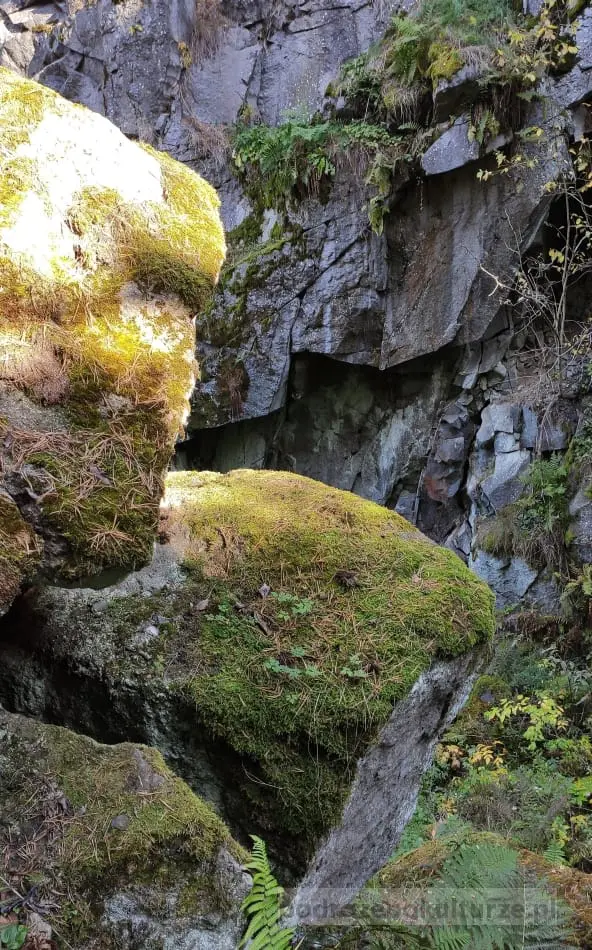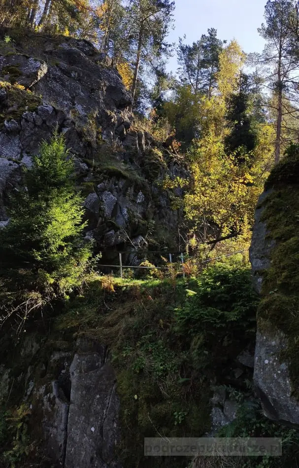Zimą na Wdżarze jeździ się na nartach, latem jeździ na rowerach (pozdrawiam fanów downhillu), a jesienią? Jesienią się wędruje Wąwozem Papieskim. Wąziutka i kręta ścieżka prowadzi dnem nieczynnego od dekad kamieniołomu. Wydobywano tu andezyt. Skałę – owszem – wulkaniczną, ale to wcale nie znaczy, że Wdżar jest wygasłym wulkanem (rozczarowani?).