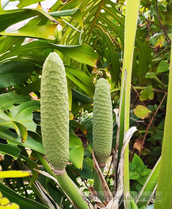 Banano-ananas to z kolei owoc poczciwej monstery dziurawej. Wygląda jak pałka pokryta łuską, dojrzewa rok, a gotowy jest do konsumpcji dopiero, gdy łuski się rozluźnią, a na miąższu pojawią się czarne kropki. Jedząc go wcześniej można sobie poparzyć podniebienia, bo niedojrzała monstera zawiera kwas szczawiowy.
