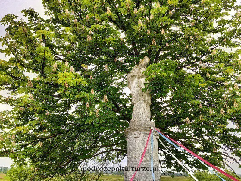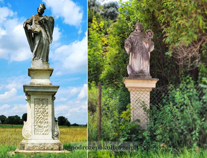 We wsi jest ich co najmniej sześć, z czego trzy barokowe figury tworzą grupę polną. Ponoć środkową figurę Jezusa Ukrzyżowanego postawiono w miejscu, w którym wykopano skrzynię skarbów wraz z listem, by opłacić nimi budowę kościoła. Towarzyszą jej święci Jan Kanty i Jan Nepomucen. Niestety grupa trochę zarosła krzakami i tylko zimą widać, że faktycznie stoją w jednej linii, wzdłuż bardzo starej, niemal niewidocznej drogi. Ustawiono je w tutaj w 1735 roku.