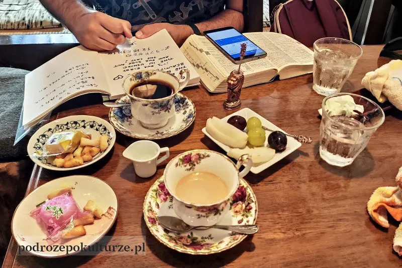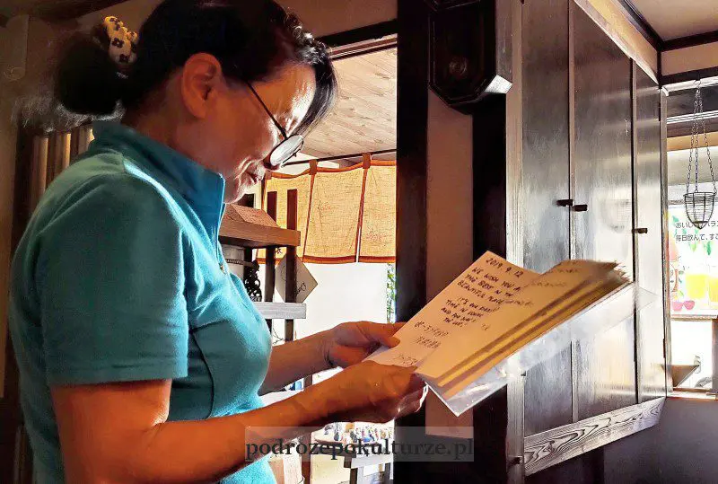 Jest tak błogo, że nie chce się wypełzać na ten żar i wracać do Matsuyamy. Olewamy pociąg, zamawiamy kolejną kawę, na stół wjeżdża stos ksiąg z wpisami gości z całego świata. Dorzucamy swoje 3 grosze. Mamie-san się chyba spodobało. Jeżeli kiedyś traficie do Uchiko i kawiarenki w machiya, to znajdziecie i naszą dedykację.