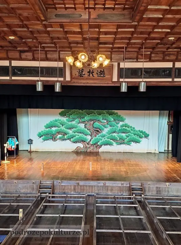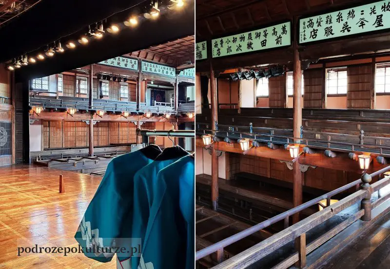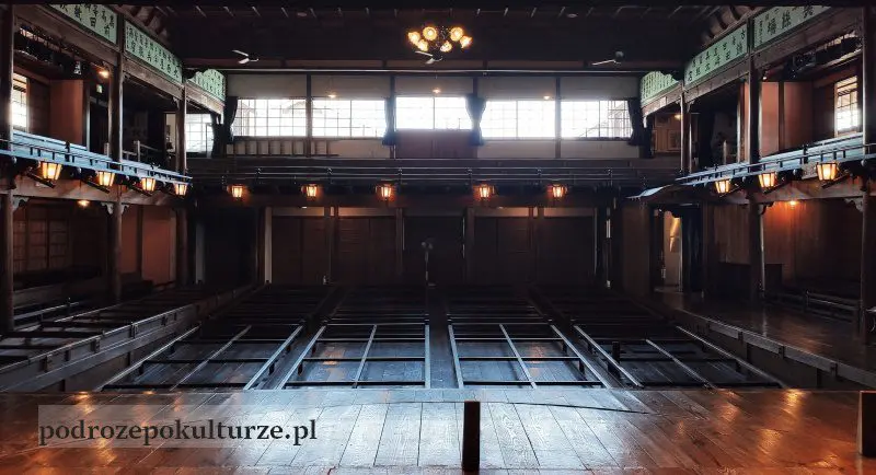 Wygląda tak, że w kasie kupuje się bilet wstępu, zzuwa obuwie własne i wdziewa kapcie (o mojej wielkiej niechęci do kapciowego reżimu w Japonii pisałam tutaj) i z planem w ręku rusza na samodzielne zwiedzanie. Teatr pachnie starym drewnem, a deski trzeszczą przy niemal każdym kroku.