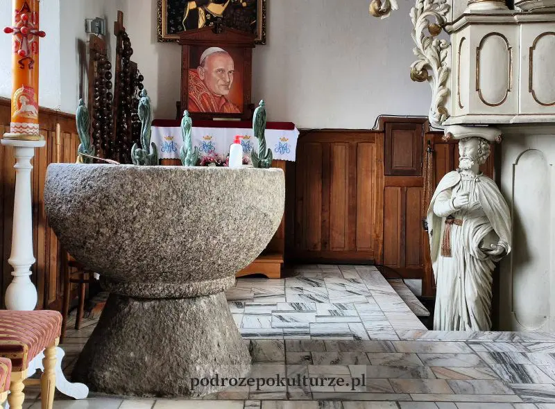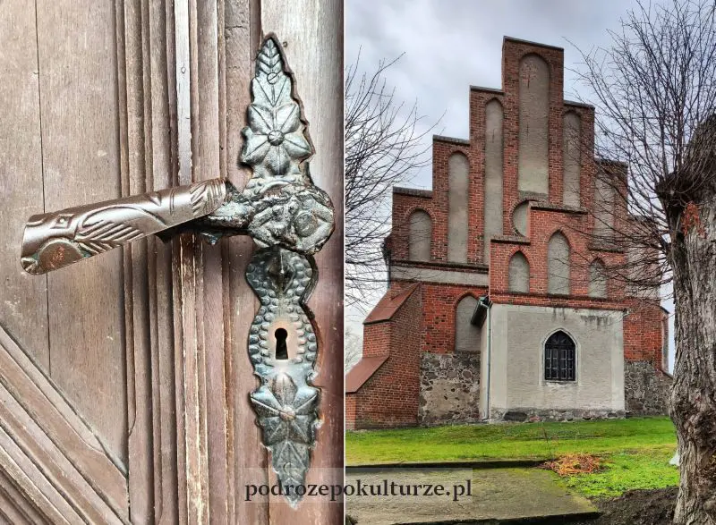 – odpowiadam i najuprzejmiej jak potrafię zagaduję gdzie znajdę „słynną płytę nagrobną”? Bo logika podpowiada, że powinna być wmurowana w ścianę, ale ściany są gołe. Kobiety na moment przerywają drapowanie. – A to trzeba pytać księdza proboszcza, my nie wiemy. Może przeoczyłam w kruchcie. – odpowiadam sobie samej, bo panie znów pochłonęła produkcja fal Dunaju (czy raczej Jezioraka, w końcu to Pojezierze Iławskie).