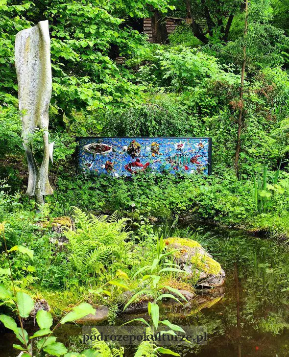 Kolejne ceramiczne dekoracje wyłaniają się w najmniej spodziewanych miejscach. Dzika znajduję w krzakach w – nomen omen – najbardziej dzikiej części parku, do której wspiąć się trzeba zarośniętymi schodkami. Motyl-gigant łypie ślepiami przy parkingu. Rybki pływają na brzegu stawu opanowanym przez karasie. Ich autorem jest Juliusz Husarski.