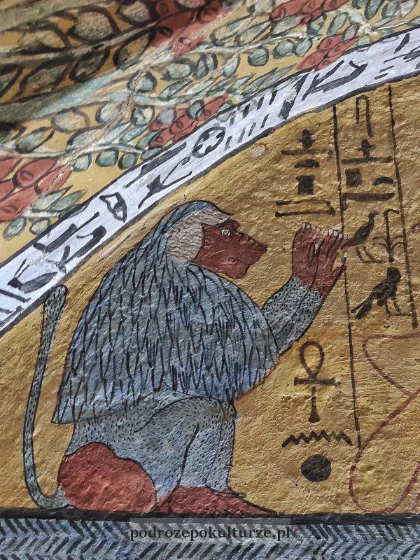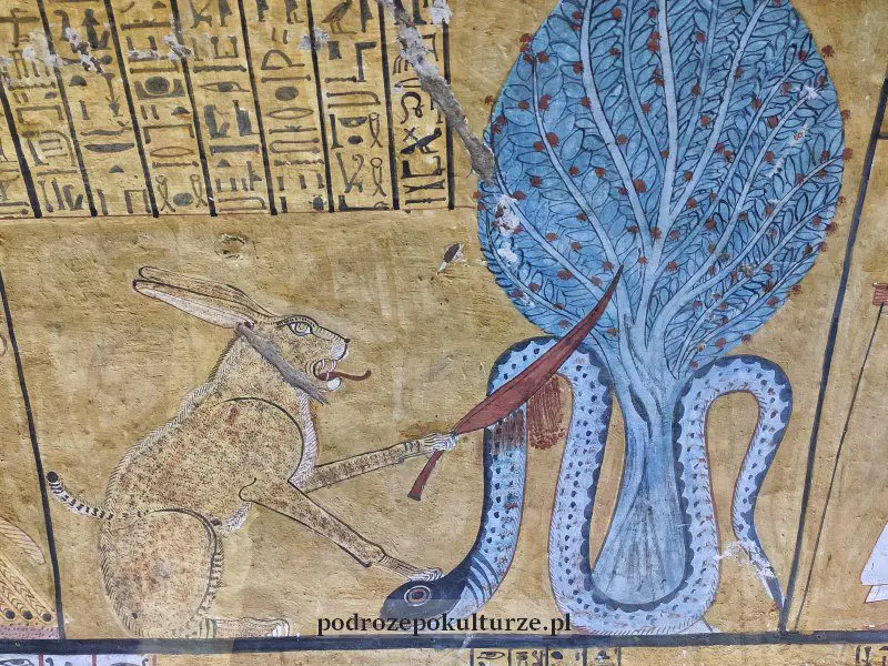 Po co te trudy? Dla malowideł na ścianach grobowców. Tak dobrze zachowanych, że wyglądają jakby namalowano je góra 35 lat temu. Tymczasem mają ok. 3500 lat. Mitologia i sacrum przeplatają się na nich ze scenkami rodzajowymi. Jak na moje oko szczególnie wiele miejsca poświęcono na nich mumifikacji, sporo też jest zwierząt. Wśród nich m.in. pawiany i diaboliczny królik (zając?) rozcinający maczetą węża.