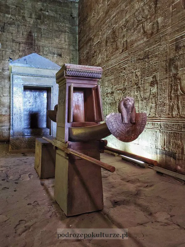 Osobliwością świątyni Horusa jest doskonale zachowane sanktuarium – najważniejszej części świątyni. W jej wnętrzu stoi wykuty z jednego kawałka granitu naos (rodzaj ogromnego relikwiarza) oraz replika barki ceremonialnej.