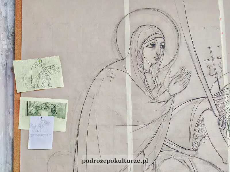 Nie ma też mozaiki bez rysunku. O. Lucjan rysuje węglem, bo można go łatwo korygować, zmieniać kreski, poprawiać linie.