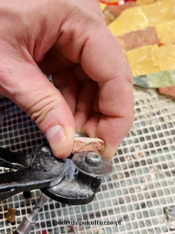 Wówczas w ruch idzie cieniutkie dłuto i młoteczek, i zaczyna się precyzyjna operacja na mozaice. Trzeba tak kuć i dłubać, by usunąć tylko fragment wymagający korekty (a nie wszystko dookoła). Przypomina to nieco leczenie kanałowe (kto zaznał tej „przyjemności” u dentysty będzie wiedział, co mam na myśli).