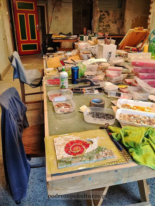 Natomiast czego nie widać od strony Łobzowskiej, to klasztorny ogród i ogromny budynek dawnej bursy. Tu powstają mozaiki, ale pracownia otwarta jest też dla osób zainteresowanych tematem.