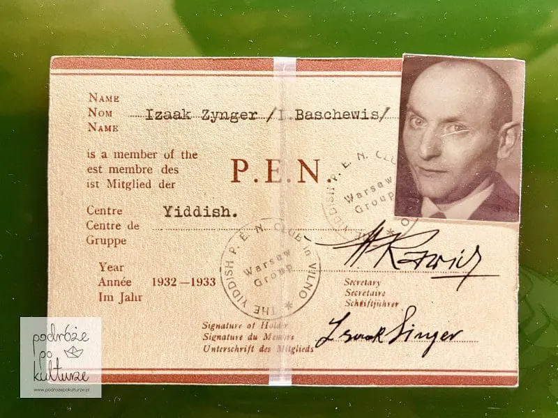 Z bogatego tematu polsko-żydowskiej literatury, której – umówmy się – można poświęcić osobną wystawę (wcale małą), postanowiłam wybrać legitymację autora „Sztukmistrza z Lublina” i laureata Literackiej Nagrody Nobla.