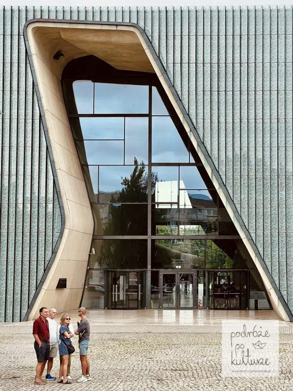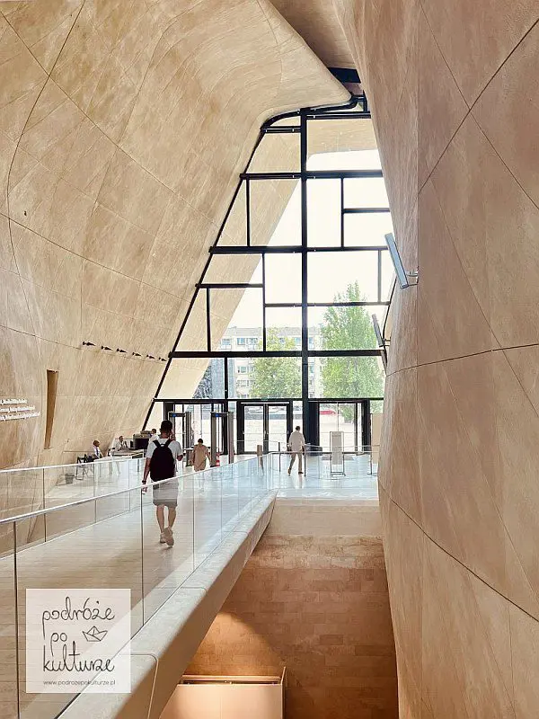Projekt fińskiego architekta Rainera Mahlamäkiego był chwalony za powściągliwość i umiar. Geometryczna bryła ma elewację obłożoną szklanymi panelami. Dopiero z bliska widać, że ornament na nich układa się w słowo „Polin” po polsku i hebrajsku. Falujące ściany ogromnego holu głównego kojarzą mi się z wyżłobionym w skale kanionem, ale Mahlamäkiego inspirowało co innego – rozstępujące się wody Morza Czerwonego. Do wnętrza prowadzi mostek, symbolicznie spinający przeszłość z teraźniejszością i przyszłością. Za plecami zostawiamy Pomnik Bohaterów Warszawskiego Getta, a wkraczamy do muzeum życia. Takie jest Muzeum POLIN.