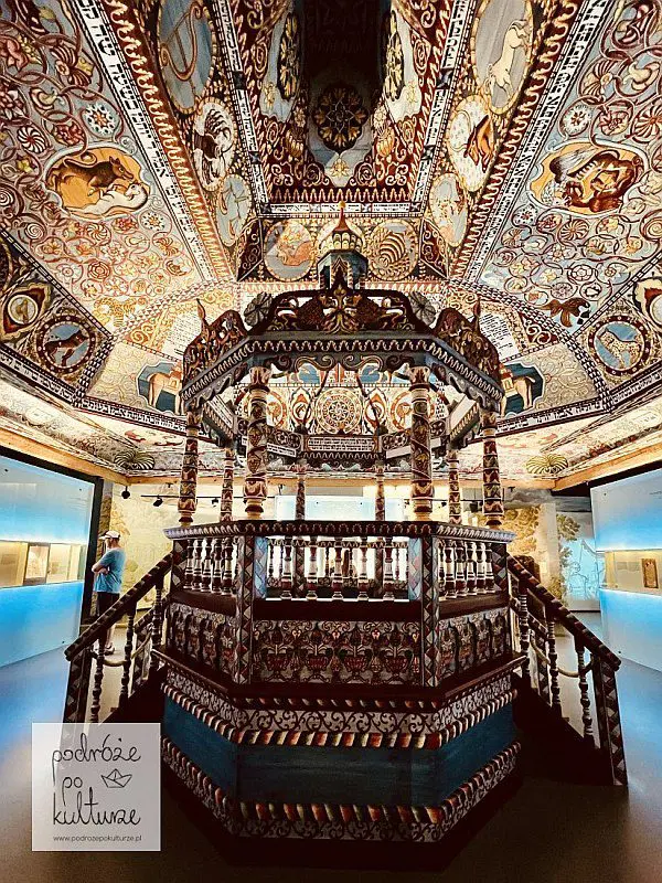 XVII-wieczny oryginał spod Lwowa doszczętnie spłonął w czasie II wojny światowej, ale szczęśliwie został dokładnie opisany i – przede wszystkim – sfotografowany. Dzięki temu udało się niemal w całości zrekonstruować bogaty wystrój malarski sali modlitewnej ukrytej pod łamanym dachem. Cudowne polichromie sklepienia oraz zdobienia bimy.