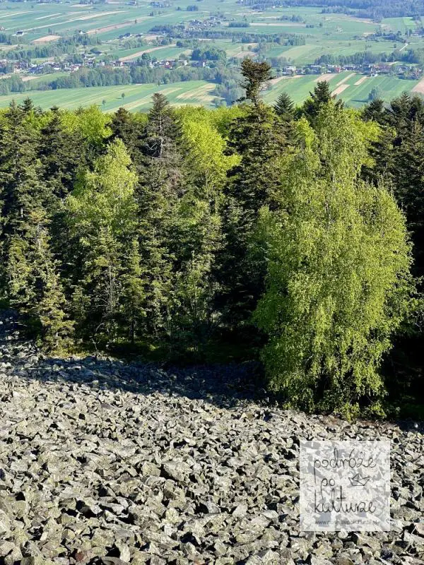 Nie wiem, naprawdę nie wiem, jak i kiedy wchodzę na Łysą Górę. Jakieś podejście było? Nie poczułam. Nie zauważyłam, kiedy doszłam do gołoborza. Tego gołoborza. THE GOŁOBORZA. Ostatni (i jedyny) raz byłam tu na wycieczce szkolnej w… 2000 roku? No to siup po metalowych schodach, by zobaczyć jeden z bardziej ikonicznych widoków Świętokrzyskiego Parku Narodowego. Krajobraz ma warstwy: kruszonka z kamulców, pas bukojodeł i szachownica pól, łąk i lasów hen, hen, hen.